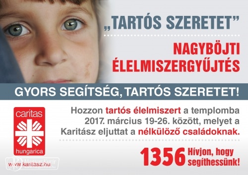 plakatA 2017. évi nagyböjti élelmiszergyűjtés során 377 kg tartós élelmiszert gyűjtöttünk, melyből 26 családot segíthettünk. Köszönjük a dunaújvárosi római katolikus testvéreink adományokban megnyilvánuló szeretetét.