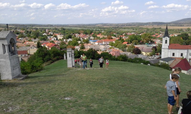 A szentmise után Spányi Antal püspök úr átlépett a gyermekekkel a „Szent Kapun”, hogy az Irgalmasság Szentévének kegyelmében részesüljenek, majd közös imára hívta a gyermekeket és hozzátartozóikat a Szent Család szobra elé. A templombelső megtekintése után nézelődtünk egy kicsit a búcsú forgatagában, melyet összekapcsoltunk a hátizsákos, „kenyértarisznyás” ebéd elfogyasztásával. Hazánk egyik legszebb kálvária dobjának a megmászása következett, ahonnan elbűvölő panoráma nyílt a kisvárosra. Egy szabadtéri szoborpark elhagyás után a csendszakasz következett, s immár énekkísérettel indítva, egymástól kissé leszakadva a zarándok-gyerekeket befelé figyelő útjukra.